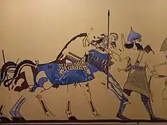 • Il est un chef de guerre et un conquérant : il a reçu du dieu Assur et des autres grands dieux la mission d'étendre les frontières de l'Assyrie et de soumettre les pays qui refusaient de reconnaître l'autorité d'Assur, ce qui crée une idéologie de la conquête soutenant l'expansionnisme militaire assyrien ; les rois sont souvent présentés comme des guerriers accomplis (ce dont relève aussi l'image du roi chasseur, populaire en Assyrie), même si en pratique tous les rois assyriens n'ont pas personnellement pris part aux combats[90],[91].