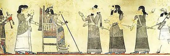 Le roi vivait entouré d'une cour, constitué de ses épouses et concubines, de grands dignitaires, dont des eunuques, et d'un nombre très important de subalternes. C'est un lieu à la vie strictement régulée, ce qui n'empêche pas que les intrigues y soient courantes, comme l'indiquent les assassinats et purges qui s'y produisent à l'époque néo-assyrienne[99],[100]. L'étude de l'administration de l'empire assyrien est complexifiée par le fait que les charges qui relèvent pour nous de l'administration centrale et de l'administration palatiale sont souvent couplées avec des charges de l'administration provinciale ou militaire, et que les attributions précises d'une fonction ne sont pas toujours bien connues.