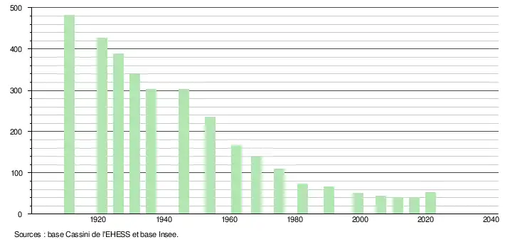 L'évolution du nombre d'habitants est connue à travers les recensements de la population effectués dans la commune depuis 1911. Pour les communes de moins de 10 000 habitants, une enquête de recensement portant sur toute la population est réalisée tous les cinq ans, les populations légales des années intermédiaires étant quant à elles estimées par interpolation ou extrapolation[19]. Pour la commune, le premier recensement exhaustif entrant dans le cadre du nouveau dispositif a été réalisé en 2006[20].