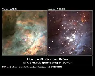 - dans l'espace de nombreuses régions ne sont pas observables en lumière visible parce qu'ils sont cachés par d'épais nuages de gaz ou de poussière interstellaire. Le rayonnement infrarouge émis par ces objets a la capacité de traverser ces obstacles sans être bloqué ou dispersé. L'astronomie infrarouge permet ainsi d'étudier le centre de notre galaxie invisible à l'œil ou les régions de la galaxie dans lesquelles se forment les étoiles et qui sont riches en poussière ;