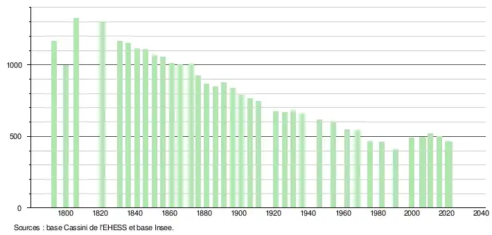L'évolution du nombre d'habitants est connue à travers les recensements de la population effectués dans la commune depuis 1793. Pour les communes de moins de 10 000 habitants, une enquête de recensement portant sur toute la population est réalisée tous les cinq ans, les populations légales des années intermédiaires étant quant à elles estimées par interpolation ou extrapolation[19]. Pour la commune, le premier recensement exhaustif entrant dans le cadre du nouveau dispositif a été réalisé en 2005[20].