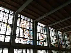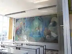 Le bâtiment accueille des œuvres d'artistes liégeois contemporains[18]. La piscine, fermée en 2002 pour plusieurs années, est ornée de mosaïques d'Adrien Dupagne. Le bâtiment abrite également des vitraux de Marcel Caron[19]. On trouve aussi des peintures de Fernand Steven[20], une fresque d'Edgar Scauflaire qui fût utilisée lors d'une représentation théâtrale d'étudiants en 1940[21], des fresques d'Auguste Mambour[16] et de Robert Crommelynck, des œuvres de Auguste Donnay que l'on trouve dans la salle des spectacles[22], une décoration d'Edmond Delsa dans la salle d'étude[23] et une mosaïque d'Oscar Berchmans[24],[25].