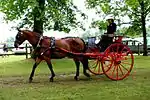 - la bride : supporte le mors auquel les guides sont attachées. La bride est munie d'œillères pour que le cheval ne voie pas sa propre voiture. Un mors adapté est employé, l'un des plus communs étant le mors Liverpool ;