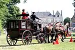 attelage en double paire, les chevaux de gauche étant montés par un postillon. À la demi daumont, il n'y a qu'une paire de chevaux avec un postillon sur le timonier gauche. Dans les deux cas, il n'y a pas de meneur dans la voiture. C'est l'attelage habituel de la Reine du Royaume-Uni mais avec 3 paires. |