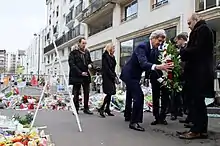 Ils sortent de l'immeuble en continuant à faire feu et en criant « Allahu akbar[33] ». En sortant, ils se retrouvent face à une patrouille de police à vélo, sur laquelle ils tirent, faisant un blessé, la scène étant filmée par un témoin. Ils crient à plusieurs reprises « On a vengé le prophète Mohammed » avant de regagner leur voiture, une Citroën C3 II noire stationnée devant l'immeuble, au bout de la rue Nicolas-Appert, à l'angle de l’allée Verte. Ils rechargent alors avec un calme relatif leurs armes[N 5].