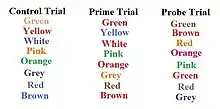 Le test de Stroop est régulièrement utilisé pour mesurer le contrôle attentionnel[12]. La capacité de contrôle donne des résultats variables selon les études, lorsqu'elle contrôle la différence entre les adultes et les enfants[13]. L’anxiété diminue la performance à ce test[14].