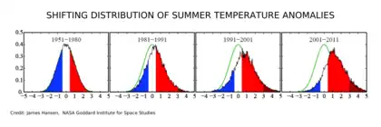 Hansen et al. (2012)[55] ont suggéré que les activités humaines avaient considérablement augmenté le risque de vagues de chaleur en été. Selon leur analyse, la superficie terrestre affectée par des anomalies de température estivale très chaudes a considérablement augmenté ces dernières décennies (voir les graphiques ci-contre). Au cours de la période de base 1951 - 1980, ces anomalies couvraient quelques dixièmes de pour cent de la superficie totale des terres[56]. Au cours des dernières années, cette superficie atteint environ 10 % de la superficie terrestre totale. Avec un taux de confiance important, Hansen et al. (2012)[56] ont attribué les vagues de chaleur de 2010 à Moscou et de 2011 au Texas au réchauffement climatique d'origine anthropique.