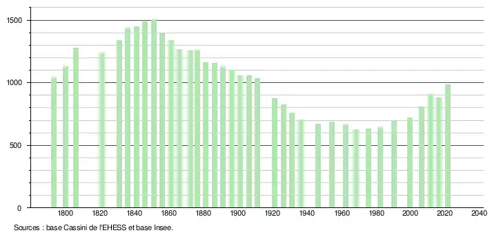 L'évolution du nombre d'habitants est connue à travers les recensements de la population effectués dans la commune depuis 1793. Pour les communes de moins de 10 000 habitants, une enquête de recensement portant sur toute la population est réalisée tous les cinq ans, les populations légales des années intermédiaires étant quant à elles estimées par interpolation ou extrapolation[27]. Pour la commune, le premier recensement exhaustif entrant dans le cadre du nouveau dispositif a été réalisé en 2006[28].