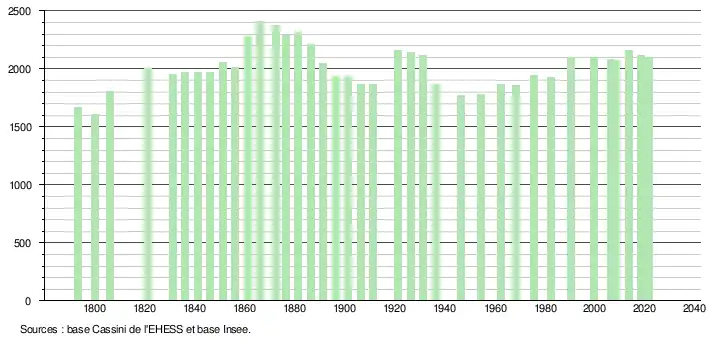 L'évolution du nombre d'habitants est connue à travers les recensements de la population effectués dans la commune depuis 1793. Pour les communes de moins de 10 000 habitants, une enquête de recensement portant sur toute la population est réalisée tous les cinq ans, les populations légales des années intermédiaires étant quant à elles estimées par interpolation ou extrapolation[27]. Pour la commune, le premier recensement exhaustif entrant dans le cadre du nouveau dispositif a été réalisé en 2008[28].
