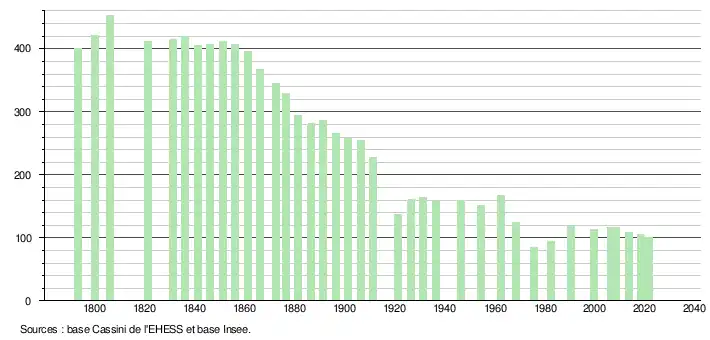 L'évolution du nombre d'habitants est connue à travers les recensements de la population effectués dans la commune depuis 1793. Pour les communes de moins de 10 000 habitants, une enquête de recensement portant sur toute la population est réalisée tous les cinq ans, les populations légales des années intermédiaires étant quant à elles estimées par interpolation ou extrapolation[20]. Pour la commune, le premier recensement exhaustif entrant dans le cadre du nouveau dispositif a été réalisé en 2008[21].