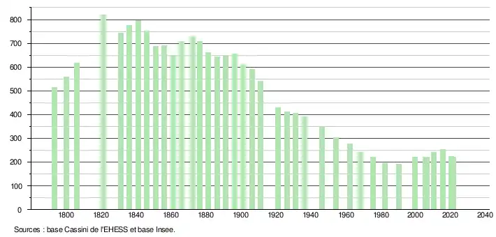 L'évolution du nombre d'habitants est connue à travers les recensements de la population effectués dans la commune depuis 1793. Pour les communes de moins de 10 000 habitants, une enquête de recensement portant sur toute la population est réalisée tous les cinq ans, les populations légales des années intermédiaires étant quant à elles estimées par interpolation ou extrapolation[24]. Pour la commune, le premier recensement exhaustif entrant dans le cadre du nouveau dispositif a été réalisé en 2005[25].