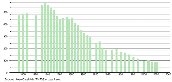 L'évolution du nombre d'habitants est connue à travers les recensements de la population effectués dans la commune depuis 1793. Pour les communes de moins de 10 000 habitants, une enquête de recensement portant sur toute la population est réalisée tous les cinq ans, les populations légales des années intermédiaires étant quant à elles estimées par interpolation ou extrapolation[14]. Pour la commune, le premier recensement exhaustif entrant dans le cadre du nouveau dispositif a été réalisé en 2007[15].