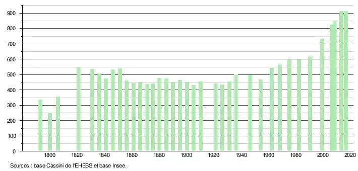 L'évolution du nombre d'habitants est connue à travers les recensements de la population effectués dans la commune depuis 1793. Pour les communes de moins de 10 000 habitants, une enquête de recensement portant sur toute la population est réalisée tous les cinq ans, les populations légales des années intermédiaires étant quant à elles estimées par interpolation ou extrapolation[6]. Pour la commune, le premier recensement exhaustif entrant dans le cadre du nouveau dispositif a été réalisé en 2008[7].
