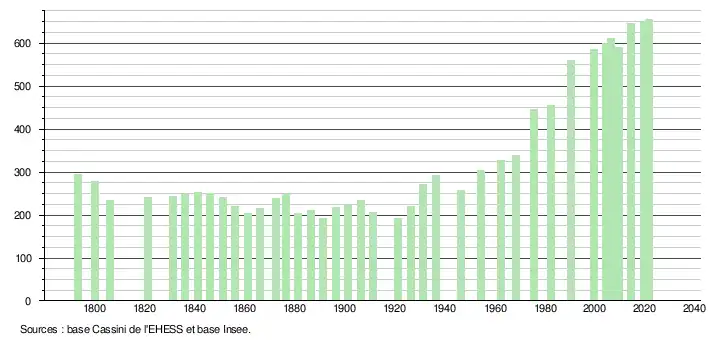 L'évolution du nombre d'habitants est connue à travers les recensements de la population effectués dans la commune depuis 1793. Pour les communes de moins de 10 000 habitants, une enquête de recensement portant sur toute la population est réalisée tous les cinq ans, les populations légales des années intermédiaires étant quant à elles estimées par interpolation ou extrapolation[25]. Pour la commune, le premier recensement exhaustif entrant dans le cadre du nouveau dispositif a été réalisé en 2004[26].