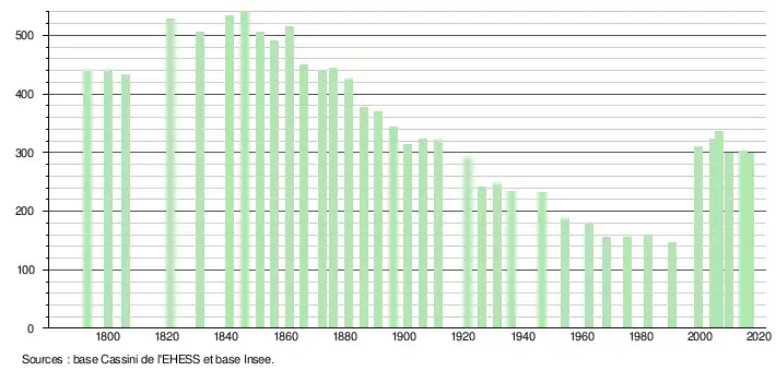 L'évolution du nombre d'habitants est connue à travers les recensements de la population effectués dans la commune depuis 1793. Pour les communes de moins de 10 000 habitants, une enquête de recensement portant sur toute la population est réalisée tous les cinq ans, les populations légales des années intermédiaires étant quant à elles estimées par interpolation ou extrapolation[17]. Pour la commune, le premier recensement exhaustif entrant dans le cadre du nouveau dispositif a été réalisé en 2004[18].