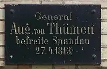À la fin de l'année, Thümen est nommé brigadier sur la Vistule, basé à Marienwerder. Il y est chargé de constituer un bataillon de réserve et de le mettre à la disposition du général von Bülow. Malgré le manque de bottes et de manteaux, Thümen peut former sept unités en très peu de temps. Après sa promotion au grade de général de division, Thümen rejoint le mars 1813 à Berlin et assiège la citadelle de Spandau. Le 26 avril, il réussit à forcer le commandant français, le général Bruny, à se rendre.