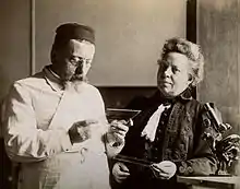 Le couple Dejerine examinant une coupe histologique de cerveau humain (date inconnue).