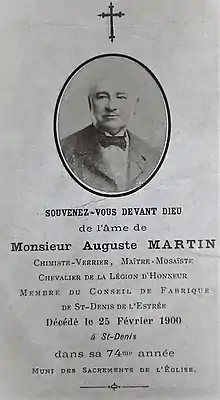 Auguste meurt le [10] en son domicile au 20 rue Génin à Saint-Denis des suites d'une grippe (influenza). Il est alors inhumé au cimetière de Saint-Denis. Pour continuer l'exploitation de l'usine, ses héritiers se constituèrent en société sous la raison sociale « René Martin et Cie ». Son petit-fils René qui travaillait avec lui depuis plusieurs années et qui était au courant de tous les secrets de fabrication fut nommé directeur. Il avait 24 ans et venait d'épouser le , Marie-Louise Simon-Girard, fille de Simon-Max, artiste lyrique, chanteur d'opérette et de Juliette Simon-Girard, cantatrice.