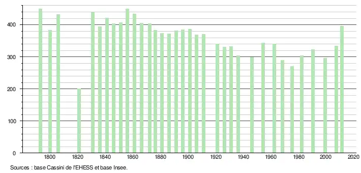 L'évolution du nombre d'habitants est connue à travers les recensements de la population effectués dans la commune depuis 1793. À partir du , les populations légales des communes sont publiées annuellement dans le cadre d'un recensement qui repose désormais sur une collecte d'information annuelle, concernant successivement tous les territoires communaux au cours d'une période de cinq ans. Pour les communes de moins de 10 000 habitants, une enquête de recensement portant sur toute la population est réalisée tous les cinq ans, les populations légales des années intermédiaires étant quant à elles estimées par interpolation ou extrapolation[7]. Pour la commune, le premier recensement exhaustif entrant dans le cadre du nouveau dispositif a été réalisé en 2007[8],[Note 1].