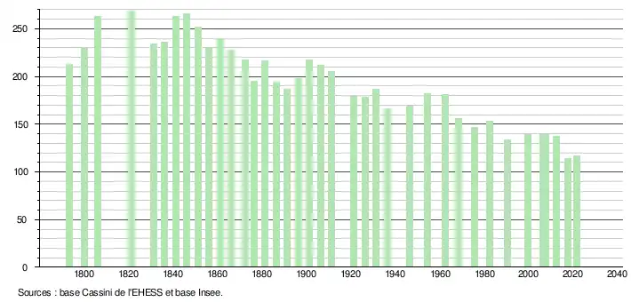 L'évolution du nombre d'habitants est connue à travers les recensements de la population effectués dans la commune depuis 1793. Pour les communes de moins de 10 000 habitants, une enquête de recensement portant sur toute la population est réalisée tous les cinq ans, les populations légales des années intermédiaires étant quant à elles estimées par interpolation ou extrapolation[31]. Pour la commune, le premier recensement exhaustif entrant dans le cadre du nouveau dispositif a été réalisé en 2007[32].