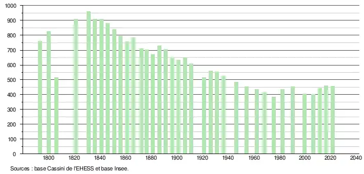 L'évolution du nombre d'habitants est connue à travers les recensements de la population effectués dans la commune depuis 1793. Pour les communes de moins de 10 000 habitants, une enquête de recensement portant sur toute la population est réalisée tous les cinq ans, les populations légales des années intermédiaires étant quant à elles estimées par interpolation ou extrapolation[18]. Pour la commune, le premier recensement exhaustif entrant dans le cadre du nouveau dispositif a été réalisé en 2006[19].
