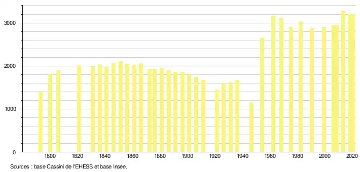 En 2020, la commune comptait 3 192 habitants[Note 1], en diminution de 2,77 % par rapport à 2014 (Calvados : +1,02 %, France hors Mayotte : +1,84 %).