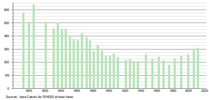 - Dans le tableau des recensements et le graphique, par convention dans Wikipédia, le principe a été retenu, pour les populations légales postérieures à 1999 de n’afficher dans le tableau des recensements et le graphique que les populations correspondant à l'année 2006, première population légale publiée calculée conformément aux concepts définis dans le décret no 2003-485 du 5 juin 2003, et les années correspondant à une enquête exhaustive de recensement pour les communes de moins de 10 000 habitants, ainsi que la dernière population légale publiée par l’Insee.