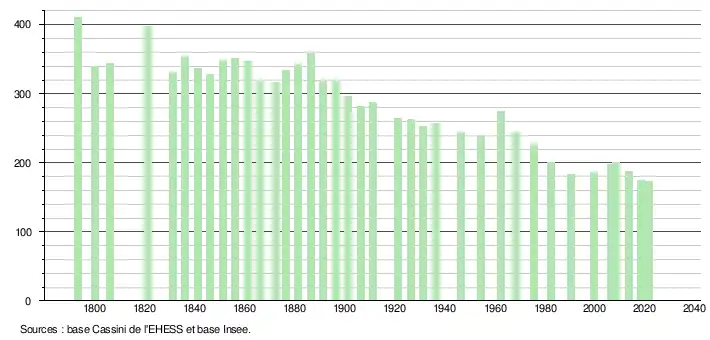 L'évolution du nombre d'habitants est connue à travers les recensements de la population effectués dans la commune depuis 1793. Pour les communes de moins de 10 000 habitants, une enquête de recensement portant sur toute la population est réalisée tous les cinq ans, les populations légales des années intermédiaires étant quant à elles estimées par interpolation ou extrapolation[21]. Pour la commune, le premier recensement exhaustif entrant dans le cadre du nouveau dispositif a été réalisé en 2008[22].