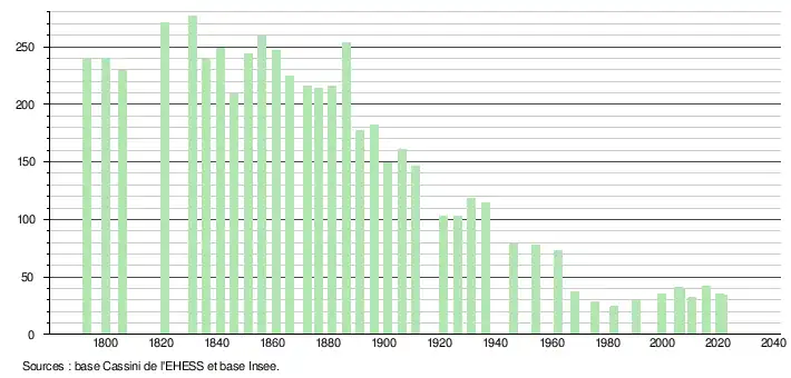 L'évolution du nombre d'habitants est connue à travers les recensements de la population effectués dans la commune depuis 1793. Pour les communes de moins de 10 000 habitants, une enquête de recensement portant sur toute la population est réalisée tous les cinq ans, les populations légales des années intermédiaires étant quant à elles estimées par interpolation ou extrapolation[40]. Pour la commune, le premier recensement exhaustif entrant dans le cadre du nouveau dispositif a été réalisé en 2005[41].