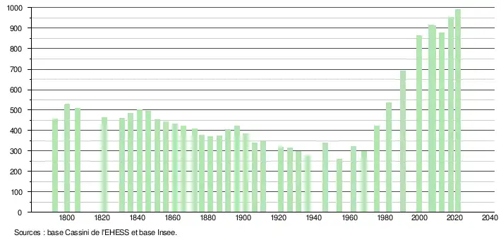 L'évolution du nombre d'habitants est connue à travers les recensements de la population effectués dans la commune depuis 1793. Pour les communes de moins de 10 000 habitants, une enquête de recensement portant sur toute la population est réalisée tous les cinq ans, les populations légales des années intermédiaires étant quant à elles estimées par interpolation ou extrapolation[17]. Pour la commune, le premier recensement exhaustif entrant dans le cadre du nouveau dispositif a été réalisé en 2007[18].