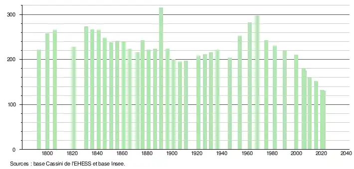 L'évolution du nombre d'habitants est connue à travers les recensements de la population effectués dans la commune depuis 1793. Pour les communes de moins de 10 000 habitants, une enquête de recensement portant sur toute la population est réalisée tous les cinq ans, les populations légales des années intermédiaires étant quant à elles estimées par interpolation ou extrapolation[14]. Pour la commune, le premier recensement exhaustif entrant dans le cadre du nouveau dispositif a été réalisé en 2005[15].