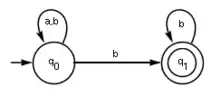 L'automate ci-contre reconnaît l'ensemble des mots infinis sur deux lettres et qui ne contiennent qu'un nombre fini de lettres , c'est-à-dire l'ensemble . En effet, pour chaque mot de , il y a une exécution qui boucle dans l'état q1 et q1 est acceptant.