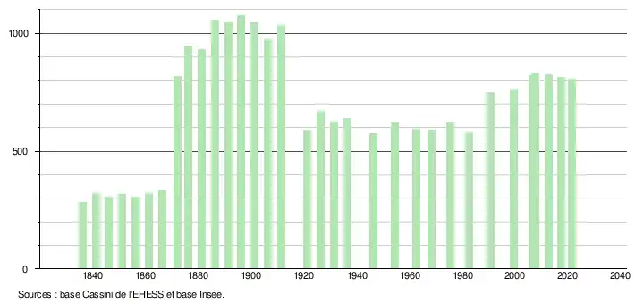 L'évolution du nombre d'habitants est connue à travers les recensements de la population effectués dans la commune depuis 1836. Pour les communes de moins de 10 000 habitants, une enquête de recensement portant sur toute la population est réalisée tous les cinq ans, les populations légales des années intermédiaires étant quant à elles estimées par interpolation ou extrapolation[26]. Pour la commune, le premier recensement exhaustif entrant dans le cadre du nouveau dispositif a été réalisé en 2007[27].