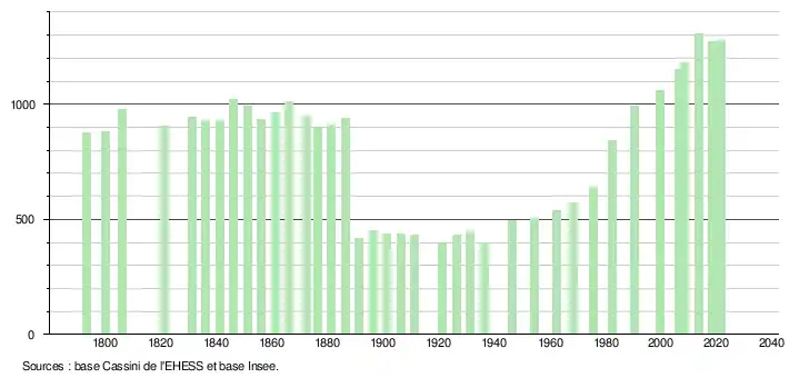 L'évolution du nombre d'habitants est connue à travers les recensements de la population effectués dans la commune depuis 1793. Pour les communes de moins de 10 000 habitants, une enquête de recensement portant sur toute la population est réalisée tous les cinq ans, les populations légales des années intermédiaires étant quant à elles estimées par interpolation ou extrapolation[39]. Pour la commune, le premier recensement exhaustif entrant dans le cadre du nouveau dispositif a été réalisé en 2008[40].