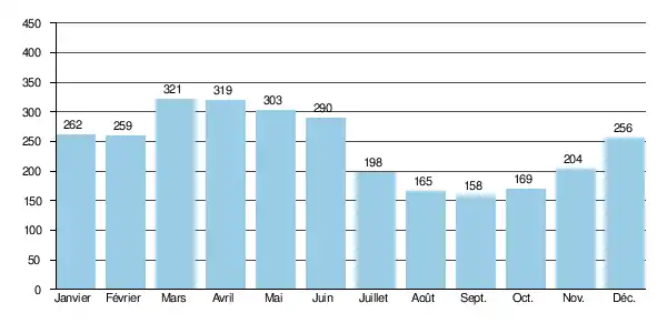 Le débit instantané maximal enregistré à La Roche-Blanche a été de 8,44 m3/s le [note 2], tandis que la hauteur maximale instantanée était de 783 mm ou 0,783 m le même jour et à la même heure. Le débit journalier maximal était de 2,39 m3/s le .