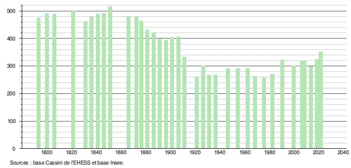 L'évolution du nombre d'habitants est connue à travers les recensements de la population effectués dans la commune depuis 1793. Pour les communes de moins de 10 000 habitants, une enquête de recensement portant sur toute la population est réalisée tous les cinq ans, les populations légales des années intermédiaires étant quant à elles estimées par interpolation ou extrapolation[17]. Pour la commune, le premier recensement exhaustif entrant dans le cadre du nouveau dispositif a été réalisé en 2008[18].