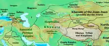 Ceux qui se dirigent vers l'Europe sont connus sous le nom d'Avars (grec : Αβάροι : Abaroi, latin : Avari, Avares) et migrent vers l'ouest, tout en poussant devant eux d'autres peuplades turco-mongoles : « les Hunnougour et Sabir et d’autres hordes hunniques » selon Théophylacte Simocatta[4] ; ce nom d’Hunnougour, transcrit par Onogoures, est, par confusion ultérieure avec les Magyars, à l'origine du nom latin d’Unguri, les Hongrois. Les Avars sont mentionnés pour la première fois au nord du Caucase en 555 par des sources syriennes (le pseudo Zacharie le rhéteur)[6]. Installés sur la Volga, ils envoient une ambassade menée par Kandikh au général byzantin Justin en Lazique en 557, par l'intermédiaire du roi des Alains du Caucase, Saros. L'empereur Justinien invite cette ambassade à Constantinople, où elle arrive en janvier 558[7]. Avec l'autorisation du Sénat, selon Ménandre le Protecteur, l'empereur charge les Avars de soumettre les nomades de la steppe pontique (aujourd'hui ukrainienne) tels que les Koutrigoures, Outigours, Antes, Sabires, Zales et autres, contre un paiement, et des terres sur le bas-Danube[8].