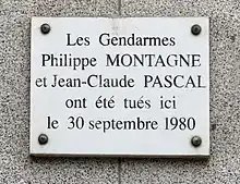 Rue Barbès no 3 : plaque en souvenir des gendarmes Montagne et Pascal tués en 1980 à proximité de la porte de la Banque Populaire de l'avenue Aristide-Briand.