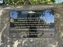 - Plaque en mémoire des Résistants de la Libération d'Épinay et de la France[8].