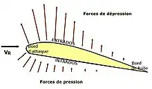 - la portance, perpendiculaire au vent relatif, vers le haut. Cette force est engendrée par la différence de pression entre le dessus et le dessous de l'aile .