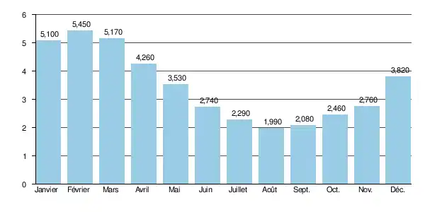 Le débit instantané maximal enregistré a été de 31,1 m3/s le 23 mars 2001, tandis que la valeur journalière maximale était de 30,3 m3/s à la même date. En comparant le premier de ces chiffres avec l'échelle des QIX de la rivière, il ressort que cette crue était d'ordre cinquantennal, destinée à ne se répéter que tous les 50 ans en moyenne.