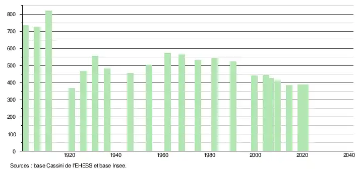 L'évolution du nombre d'habitants est connue à travers les recensements de la population effectués dans la commune depuis 1901. Pour les communes de moins de 10 000 habitants, une enquête de recensement portant sur toute la population est réalisée tous les cinq ans, les populations légales des années intermédiaires étant quant à elles estimées par interpolation ou extrapolation[18]. Pour la commune, le premier recensement exhaustif entrant dans le cadre du nouveau dispositif a été réalisé en 2004[19].