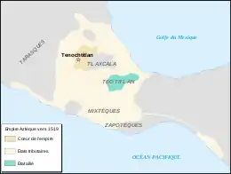 À la veille de la conquête espagnole, l'altepetl de Mexico-Tenochtitlan avait soumis à sa domination de nombreux autres altepetl, gagnant ainsi le titre de « huey altepetl » (« grand altepetl »). Cet empire était divisé en 38 provinces plus ou moins assujetties, qui constituaient des cadres économiques et de perception du tribut[59]. Il était composé de plusieurs ethnies différentes les unes des autres, dont certaines ne parlaient pas le nahuatl[43]. Il ne formait pas un ensemble territorial cohérent : par exemple, la région méridionale et périphérique de Xoconochco ne se trouvait pas en contact direct avec le centre de l’empire. Tlaxcala au centre, Metztitlán au nord et Teotitlan au sud, étaient des enclaves indépendantes à l'intérieur de l'empire aztèque[60]. Les frontières étaient surveillées par des garnisons et protégées par quelques fortifications comme à Oztoman[61].