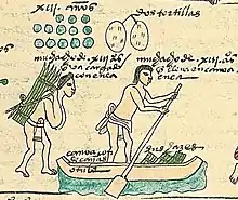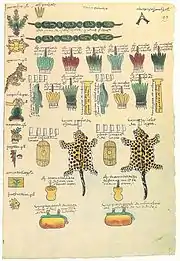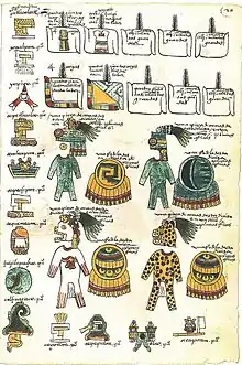 Le tribut devait être acquitté entre une et quatre fois par an selon sa nature[67]. Il était levé par un fonctionnaire (calpixqui) aidé d'une équipe de scribes. Deux registres des tributs sont parvenus jusqu'à nous : la Matricula de Tributos et le Codex Mendoza[68]. Le tribut était en nature : il était souvent composé de coton ou de l’ixtle (fibre d’agave). Mais il pouvait également être fourni en, produits agricoles, en métaux, en turquoises, en bois, en animaux, en vêtements et en objets divers. La monnaie n'existait pas, mais le quachtli et son multiple, la charge, faisaient office d'étalon[69]. L'ensemble des impôts était entreposé dans le trésor (petlacalco) du palais impérial[70].