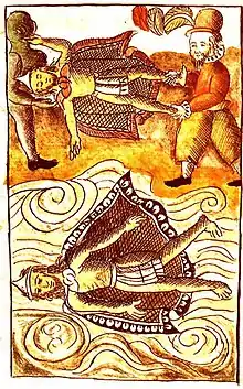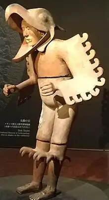 Selon la tradition aztèque rapportée notamment dans les codex, en l'année 2-maison (1325), sur une petite île marécageuse au milieu du lac Texcoco, les futurs Mexicas auraient vu un aigle perché sur un cactus ; selon les sources, cet aigle tenait dans ses serres une figue de barbarie (tenochtli en nahuatl)[25] ou un serpent[26],[24], bien que cette dernière hypothèse soit probablement une interprétation peu pertinente, à l'époque coloniale, du glyphe « atl-tlachninolli » (représentant un double courant d'eau et de feu symbolisant la guerre), qui sort du bec de l'oiseau sur la seule pièce archéologique représentant cette scène[27]. Cette erreur d'interprétation a peut-être été volontairement diffusée par les Espagnols pour occulter toute référence aux sacrifices humains (la figue de barbarie symbolisant en effet le cœur des sacrifiés)[28].
