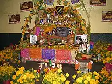 La fête des morts mexicaine, par exemple, reprend notamment les traditions des offrandes de nourriture (en particulier sous la forme elle-même syncrétique du pan de muerto et des calaveras de alfeñique) et d'encens sur un autel ou un petate cérémoniel, du papel picado et l'utilisation de fleurs de cempaxochitl pour guider l'âme des défunts[52].