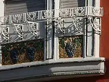 L'aspect décoratif des façades est accentué par une tour d'angle surmontée d'un toit pyramidal, par un balcon à l'étage avec une lourde balustrade en pierres et par une colonne d'angle moulurée et ornée d'un chapiteau ; au-dessous de ce balcon se trouve l'entrée principale de la partie commerciale de l'édifice. Les deux façades se terminent par des avancées peu profondes couronnées par des frontons triangulaires[1]. L'une des façades est ornée d'une fenêtre en baie décorée de plaques en céramique et de reliefs en porcelaine[1].