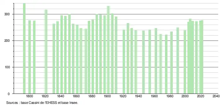 L'évolution du nombre d'habitants est connue à travers les recensements de la population effectués dans la commune depuis 1793. Pour les communes de moins de 10 000 habitants, une enquête de recensement portant sur toute la population est réalisée tous les cinq ans, les populations légales des années intermédiaires étant quant à elles estimées par interpolation ou extrapolation[29]. Pour la commune, le premier recensement exhaustif entrant dans le cadre du nouveau dispositif a été réalisé en 2004[30].