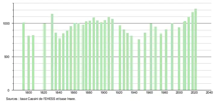 | L'évolution du nombre d'habitants est connue à travers les recensements de la population effectués dans la commune depuis 1793. Pour les communes de moins de 10 000 habitants, une enquête de recensement portant sur toute la population est réalisée tous les cinq ans, les populations légales des années intermédiaires étant quant à elles estimées par interpolation ou extrapolation[24]. Pour la commune, le premier recensement exhaustif entrant dans le cadre du nouveau dispositif a été réalisé en 2007[25]. En 2021, la commune comptait 1 215 habitants[Note 3], en augmentation de 7,14 % par rapport à 2015 (Landes : +4,9 %, France hors Mayotte : +1,84 %). |