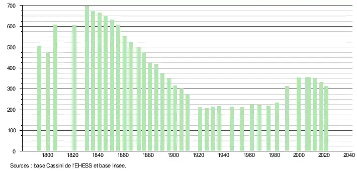 L'évolution du nombre d'habitants est connue à travers les recensements de la population effectués dans la commune depuis 1793. Pour les communes de moins de 10 000 habitants, une enquête de recensement portant sur toute la population est réalisée tous les cinq ans, les populations légales des années intermédiaires étant quant à elles estimées par interpolation ou extrapolation[20]. Pour la commune, le premier recensement exhaustif entrant dans le cadre du nouveau dispositif a été réalisé en 2007[21].